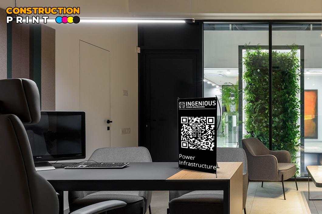 - Portable desktop banner stand for event booths and corporate counters